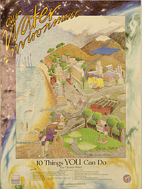 LOS ANGELES WATER POSTER FOR PUBLIC SCHOOLS Following the city's first Earth Day, together with the L.A. Water Board, SPDT painted and produced the project distributed to every school. The poster was a question and answer game that shows the street drainage system flowing into Santa Monica Bay. Los Angeles street curbs now have dolphin symbols asking people to protect the bay.